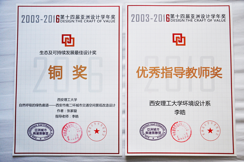 11月24日至11月27日,在北京交通大学举办的2016亚洲城市与建筑国际学术会议暨第十四届亚洲设计学年奖颁奖典礼上,公司申博sunbet环境设计系李皓老师指导的员工张家璇设计作品《自然呼吸的绿色廊道——西安市南二环城市交通空间景观改造设计》,在本次竞赛中荣获生态及可持续发展设计铜奖。同时,李皓老师荣获本次竞赛优秀指导教师奖,公司申博sunbet环境设计系被授予优秀组织管理奖。