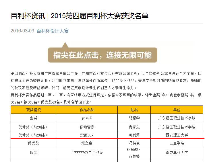 据悉,第四届百利杯大赛由广东省家具协会主办,以“SOHO办公家具设计”为主题,设计大赛共收到来自中国及海外百所高校共1300多份作品,竞争激烈。