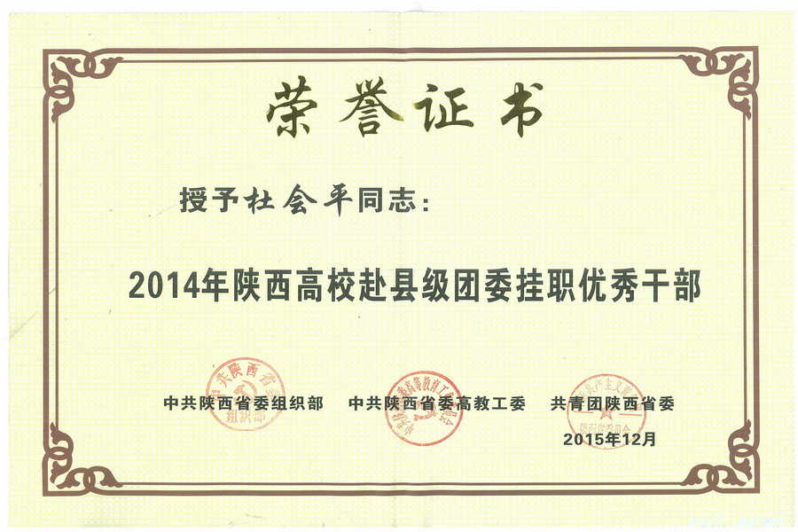 12月3日,由省委组织部、省委高教工委、团省委联合举办的2015年陕西高校团干部赴县级团委挂职出征仪式暨2014年优秀挂职干部表彰大会在西安举行。公司挂职干部杜会平同志荣获“陕西高校赴县级团委挂职优秀干部”荣誉称号。