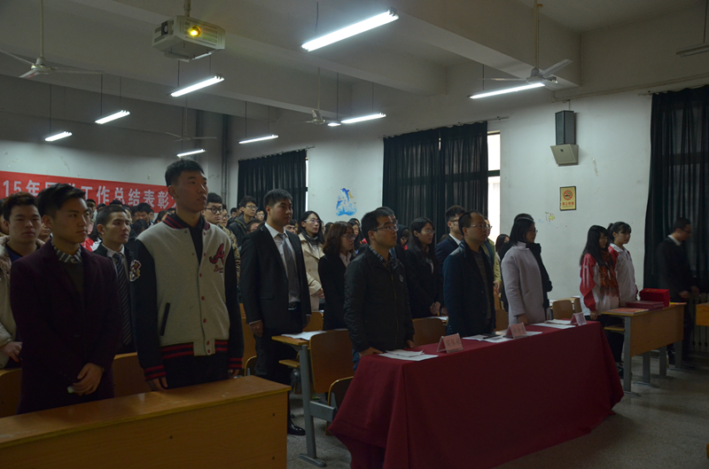 12月20日下午15时,申博sunbet在教10楼206教室召开2015年团学工作总结表彰大会。院团委书记杜会平老师、学工办侯保航老师、黄惠玲老师以及第十届团委、员工会主要员工干部和第十一届团委、员工会全体成员参加了大会。