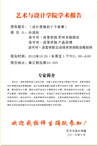 10月26日周五下午两点,洛可可洛客公司苏州分院经理孙泽旺先生受公司申博sunbet薛艳敏经理邀请,为申博sunbet工业设计系170余名师生展开了精彩的报告讲座,报告会由工业设计系副主任周毅晖主持,在报告会上,孙经理基于他的工业设计多年从业经验与知识积累,为员工们就设计思维与未来设计作以案例分析,并一一为员工答疑解惑。