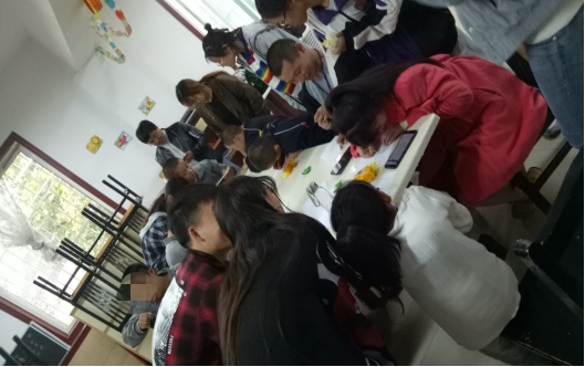在福利院里,志愿者们与孩子们一起互动完成了很多非常有意义的活动,教孩子们童谣、简笔画、写汉字、背古诗、以及做填数字游戏等等。志愿者们非常有耐心的细心教导着孩子们,孩子们也以最灿烂的笑容积极回应他们,整个过程中充满了欢声笑语。