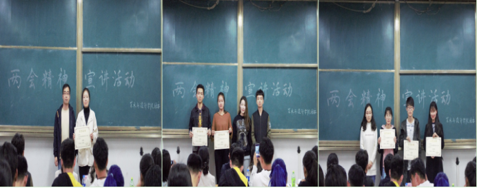 此次宣讲,各位同学以各种鲜明的观点,精辟的论述,从全国两会基本概况、中央领导同志重要讲话精神以及几个工作报告和国务院机构改革等六大方面展开宣讲,深入浅出、脉络清晰、全面生动地解读了全国两会精神的实质和丰富内涵,并结合自身学习体会表示要从实际行动去践行两会精神,切实在学懂、弄通、做实上下功夫。最终,王香凝同学获得一等奖,骆俊瑛、周中泽同学获得二等奖,刘梦真、刘佩佩、蔡逸群同学获得三等奖,闫正琦、林佳一、史豪琦、蔺雅各等同学获得优秀奖。