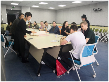 在简单的练习之后,赵老师又邀请了几位同学说说他们所熟悉的汉字,并鼓励他们在黑板上尝试书写,随后赵老师一一进行了指导。在随后的授课过程中,老师了解到许多职工都为自己起了一个中文名字,他们将自己的名字写在宣纸上,由赵老师教他们如何用不同的书法字体写下自己的名字。