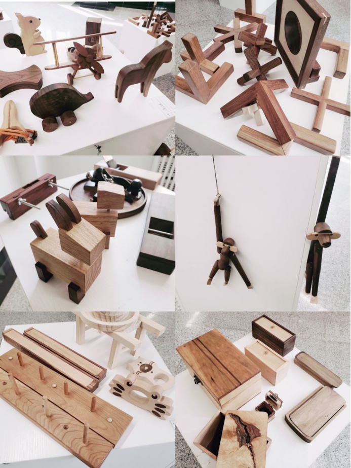 展览现场的实木作品包括:日常生活家具、儿童玩具、装饰摆件等40余件,全部在公司实验中心的FESTOOL和木工综合实验室设计加工,涉及现代木工工具中的锯、刨、磨、钻、车以及木工CNC等诸多设备。