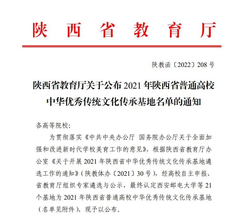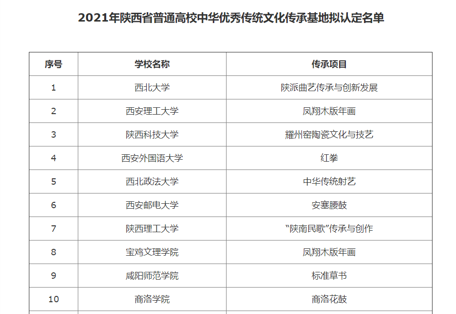 陕西省中华优秀传统文化传承基地由省教育厅组织专家遴选,旨在通过支持高校围绕民族民间音乐、民族民间美术等传统文化项目建设传承基地,大力推进中华优秀传统文化全方位融入高校教育,充分发挥高校文化传承创新的优势与作用。