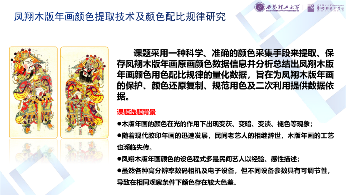 经过教学的多年结合,公司师生在基于木版年画的创作和研究方面产出了丰硕的教学和科研成果,科研项目包括“凤翔木版年画及其文化背景研究”、“陕西凤翔木版年画色彩数字化保护研究——颜色提取关键技术及色彩数据库开发”等,杜杰副教授团队更于2017年获批教育部人文社科基金项目“凤翔木版年画颜色提取技术及颜色配比规律研究”, 该课题在对凤翔木版年画特征充分调研和学习的基础上,通过印刷色彩学的色彩采集手段及表色方法来科学客观地记录民间主观色彩的色值,通过艺工交叉的研究方法对年画的传承提出了自己的方法。相关研究在多个核心期刊进行了发表。