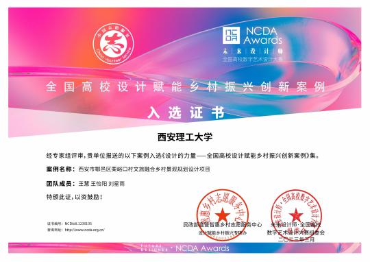在该书编创期间,共收到近500个申报案例,最后收录了136所高校的142个设计赋能乡村振兴优秀实践案例,较为全面地展示了近年来我国高校设计专业在发挥学科优势赋能乡村振兴及教学创新的成果。此次公司环境设计专业王慧副教授团队 (成员:教师王怡阳、员工刘星雨) 关于依据“三生+五味”的乡村文旅新模式,将栗峪口村打造为民俗风情浓郁、生态环境优美、文化氛围浓厚、配套设 施完善,具有自然科普和服饰文化教育价值的宜居宜游美丽新乡村的项目入选, 既是对公司积极开展设计赋能乡村振兴创新实践,以赛促教,发挥学科竞赛“立 德树人”功能,投身乡村振兴志愿服务屡结硕果的充分肯定,同时也激励广大师 生进一步积极参与创新设计、以专业知识服务城乡经济建设和社会发展,引导师 生弘扬传统美德,传承传统文化,宣传乡村文旅,助力乡村振兴。