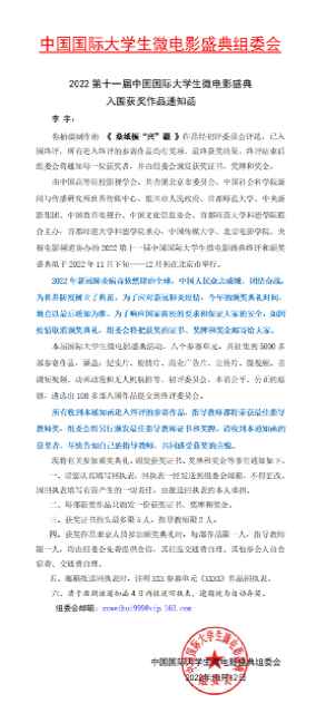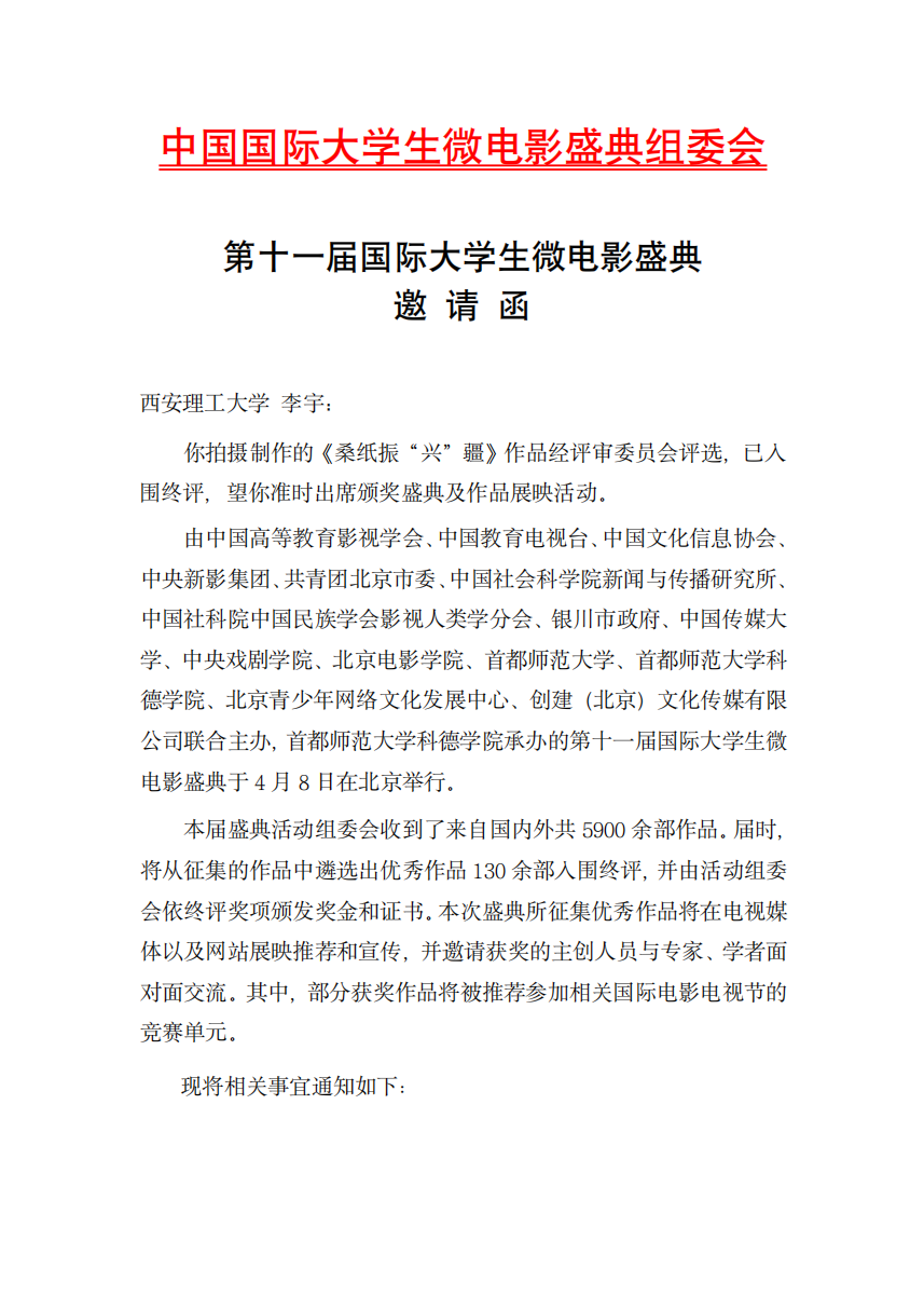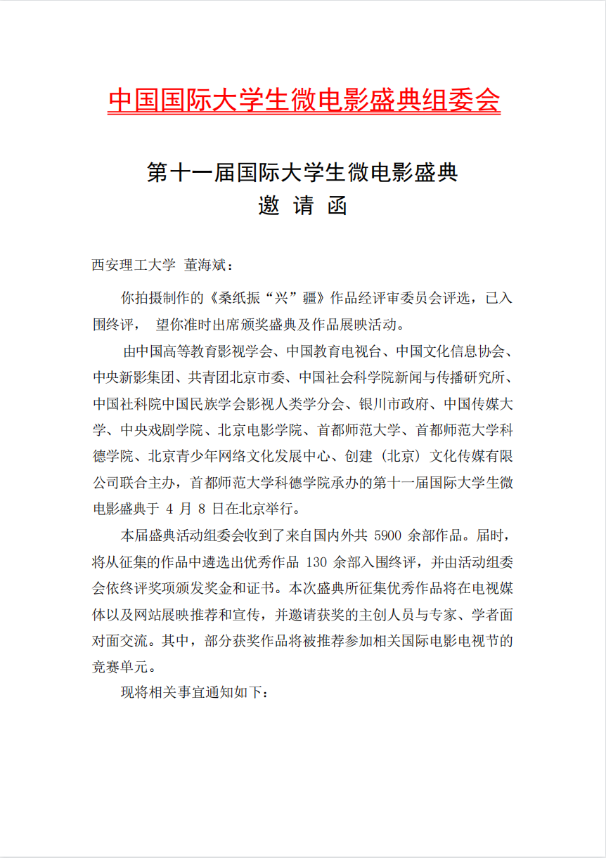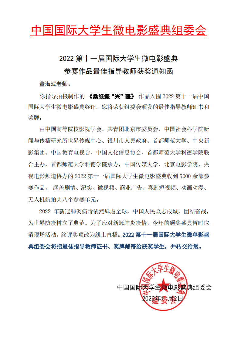 紧随时代脉搏,传递社会正能量。近日,由中国高等院校影视学会、共青团北京市委员会、中国社会科公司新闻与传播研究所世界传媒中心、银川市人民政府、首都师范大学、中央新影集团、中国教育电视台、中国文化信息协会、首都师范大学科德公司联合主办,首都师范大学科德公司承办,中国传媒大学、北京电影公司、央视电影频道协办的2022第十一届中国国际老员工微电影盛典终定于2023年4月8日在北京举行。由公司申博sunbet影像动画系董海斌副教授带领员工李宇、高毅拍摄制作的《桑纸振“兴”疆》作品,经初评委员会评选,该作品已入围终评,董海斌副教授获“最佳指导教师”奖项。
