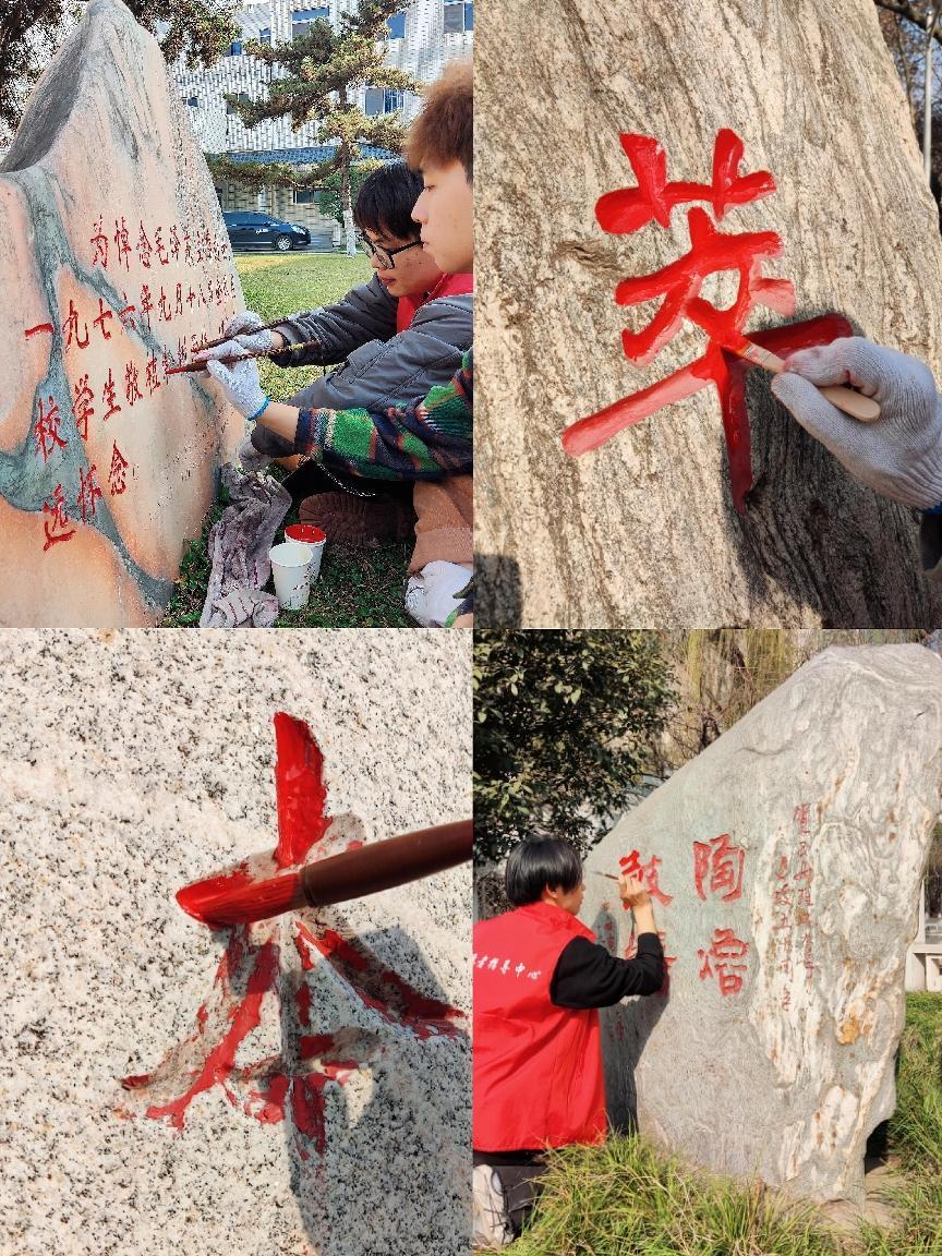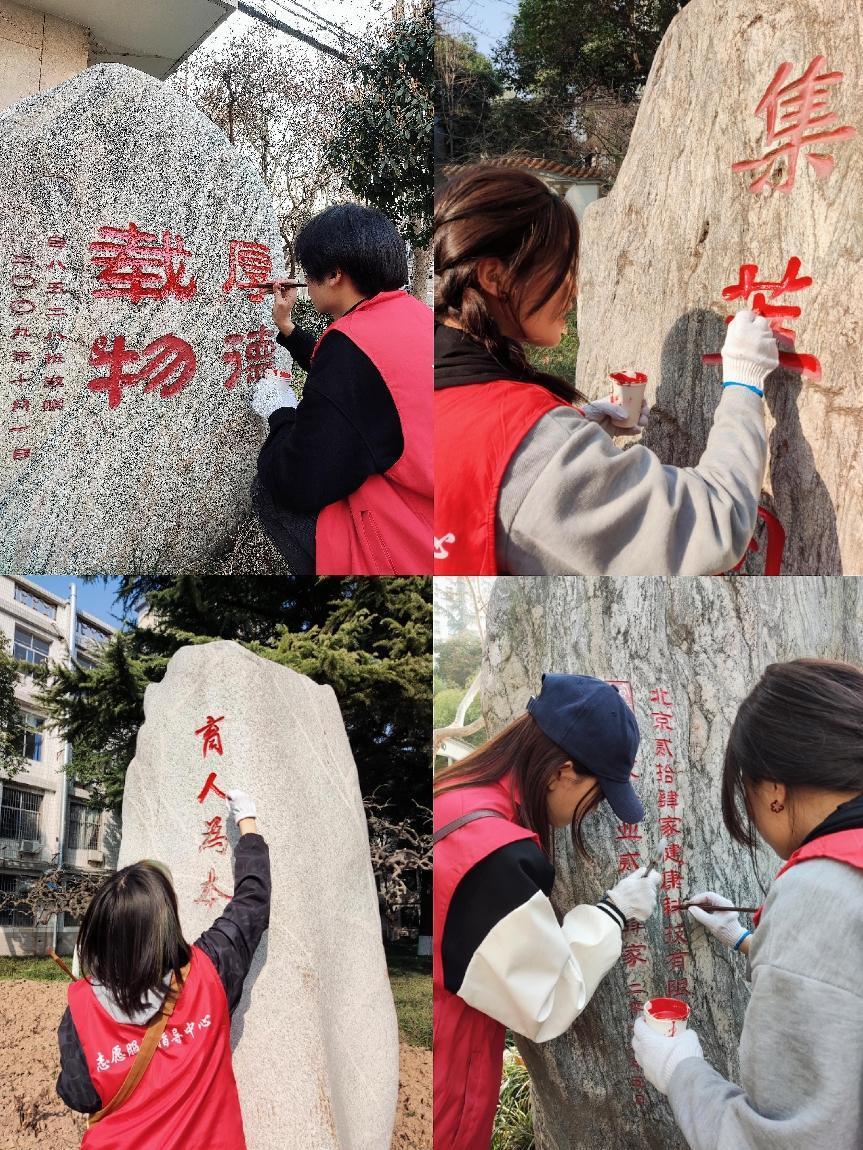 3月5日,志愿者们来到理工大金花校区,按照既定安排,两人一组,给纪念石擦去尘土后,用颜料和画笔精心描绘。笔尖落下的红墨,让度过了74个春秋的纪念石再次焕然一新,为校园风景增添了一抹靓丽的色彩。志愿者们在一笔一划的描红过程中,感受到了纪念石的古朴内涵,感受到了校园浓厚的文化氛围,感受到了为大家服务的满足感与自豪感。