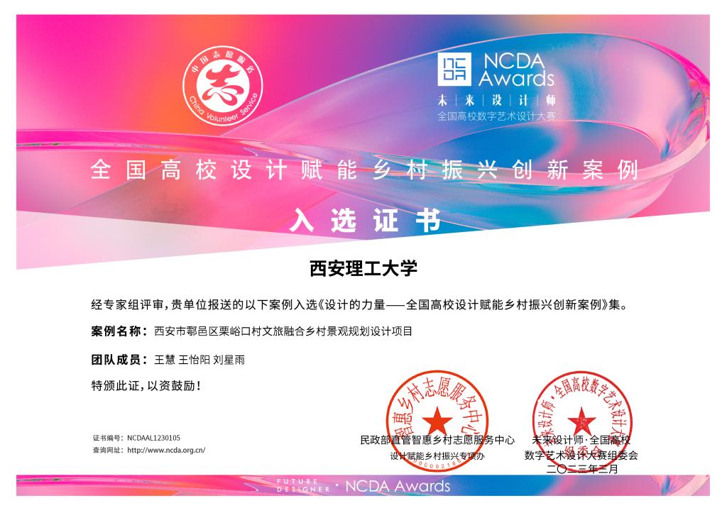 在该书编创期间,共收到近500个申报案例,最后收录了136所高校的142个设计赋能乡村振兴优秀实践案例,较为全面地展示了近年来我国高校设计专业在发挥学科优势赋能乡村振兴及教学创新的成果。此次公司环境设计专业王慧副教授团队(成员:教师王怡阳、员工刘星雨)关于依据“三生+五味”的乡村文旅新模式,将栗峪口村打造为民俗风情浓郁、生态环境优美、文化氛围浓厚、配套设施完善,具有自然科普和服饰文化教育价值的宜居宜游美丽新乡村的项目入选,既是对公司积极开展设计赋能乡村振兴创新实践,以赛促教,发挥学科竞赛“立德树人”功能,投身乡村振兴志愿服务屡结硕果的充分肯定,同时也激励广大师生进一步积极参与创新设计、以专业知识服务城乡经济建设和社会发展,引导师生弘扬传统美德,传承传统文化,宣传乡村文旅,助力乡村振兴。