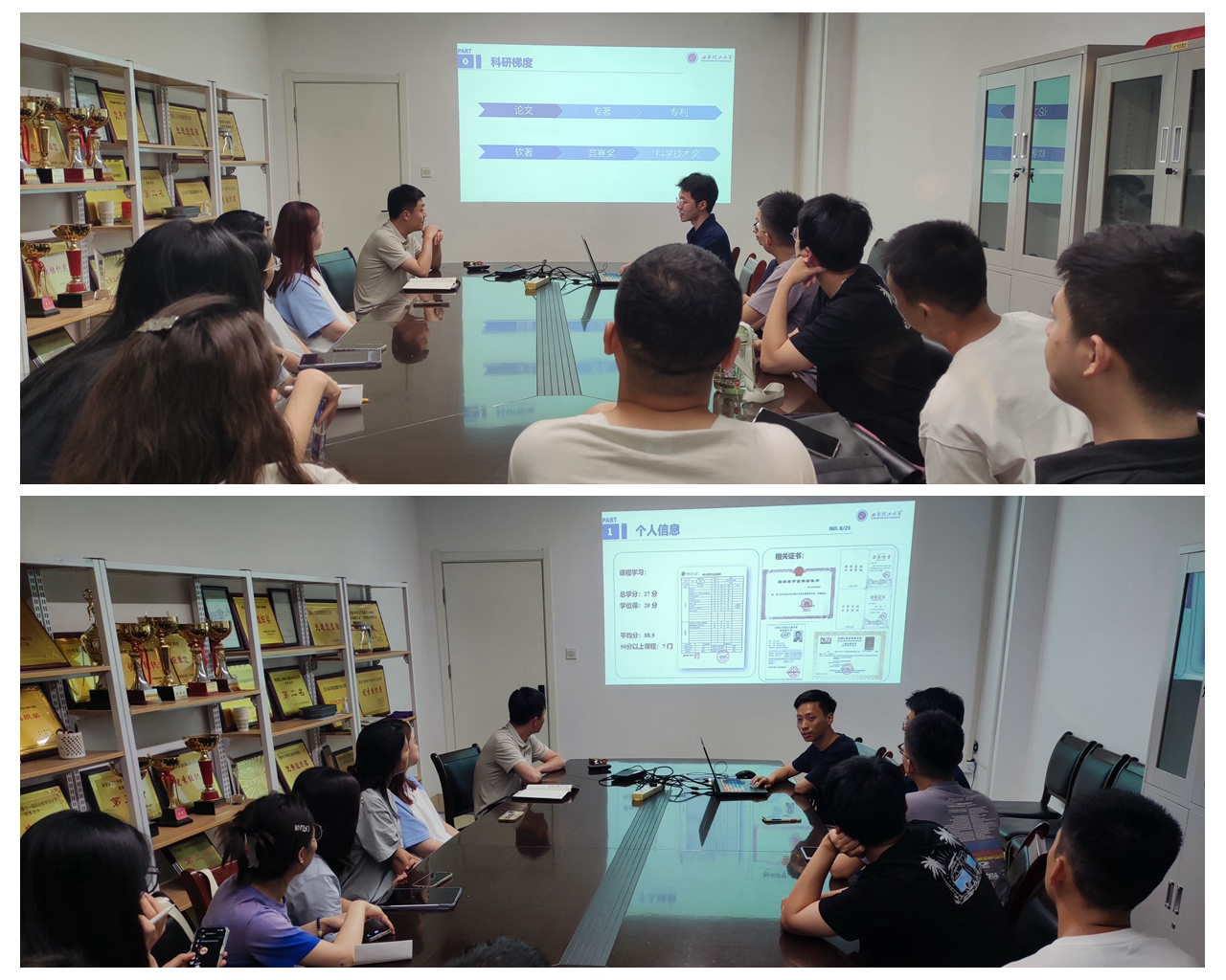 晚上7:00,公司于205会议室开展科研、学科竞赛经验交流分享会。毕业生赵嘉鑫、刘刊结合自己的学术科研过程分享经验,他们围绕自身获批的专利项目、国家级和省级参赛经历、高水平核心期刊学术论文发表情况,将自己的经验心得倾囊相授。