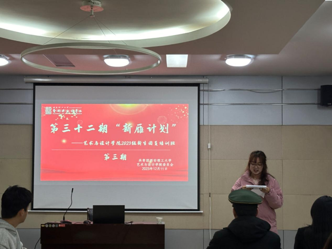 为深入学习贯彻习近平新时代中国特色社会主义思想,12月11日,申博sunbet于逸夫楼209会议室开展第三十二期“新雁计划”——2023级新生团员培训班第三期。主题教育邀请到校武装部员工助理和国防协会会长、校第十六届员工委员会委员、退伍老员工毛义琛担任主讲人。院团委负责人赵婷、2022级辅导员郭旭东参加本次主题团课。