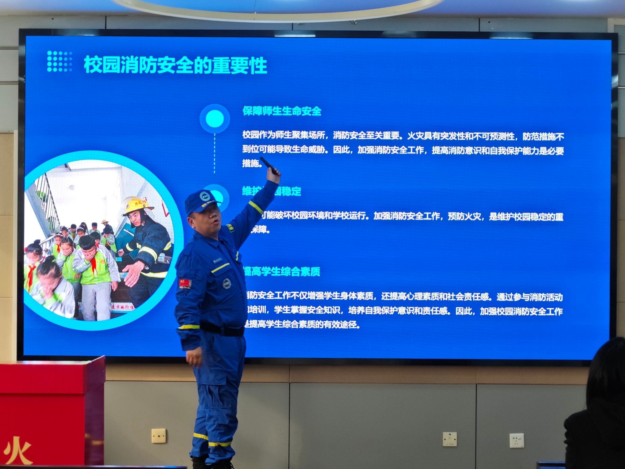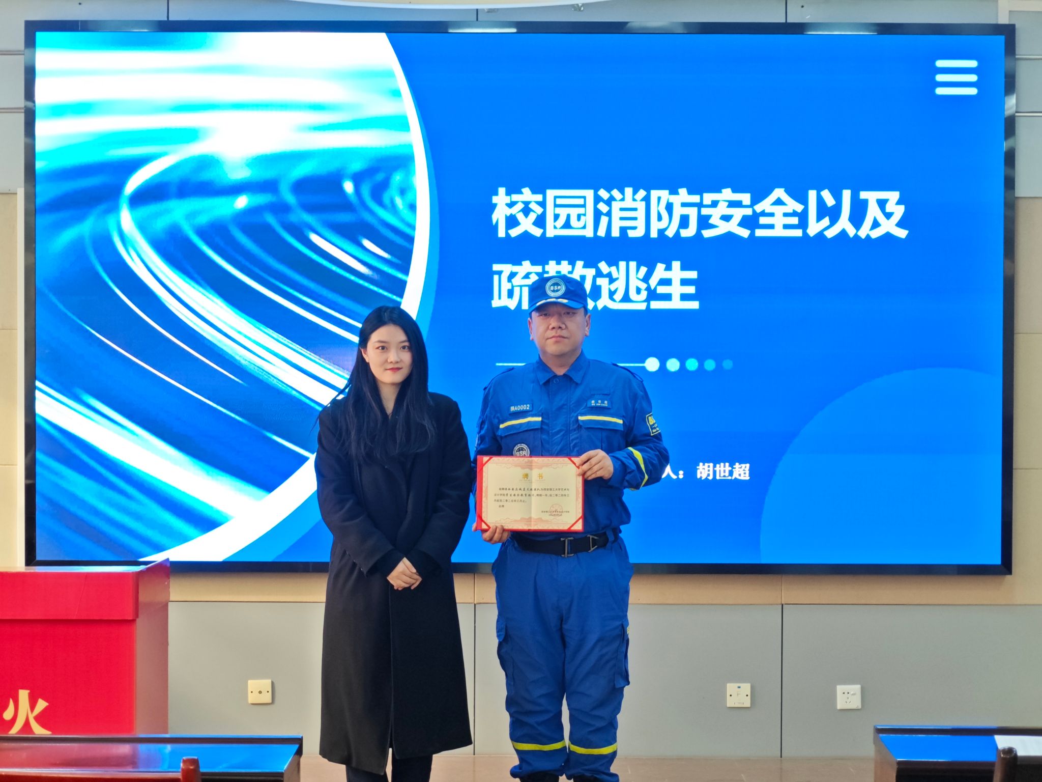 讲座中,西安众诚蓝天救援队副队长胡世超通过真实火灾案例,图文并茂地为大家讲解了消防安全的重要性,并围绕火灾的防范、扑救和自救等内容,重点讲述了校园生活中安全防火知识及火灾逃生技能。