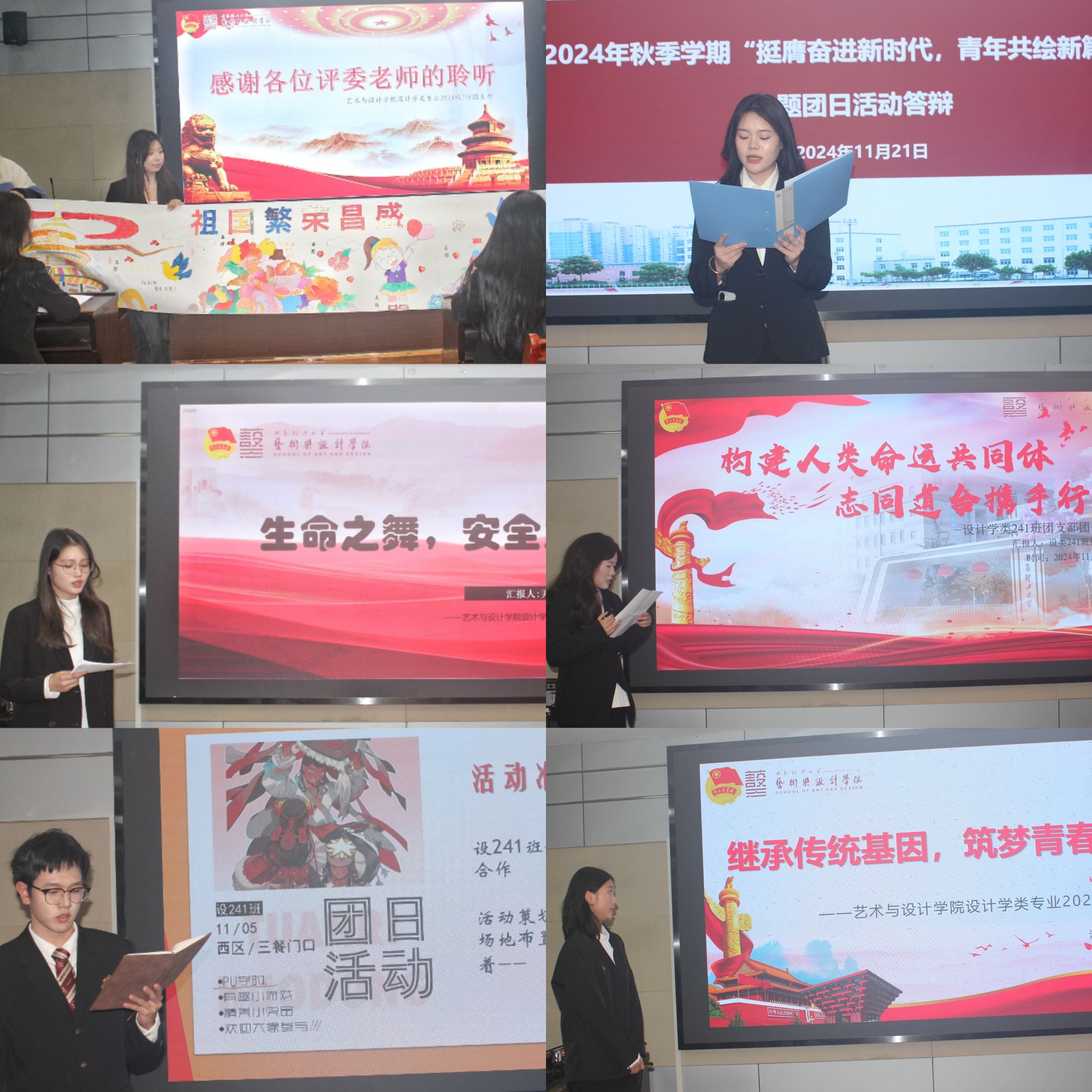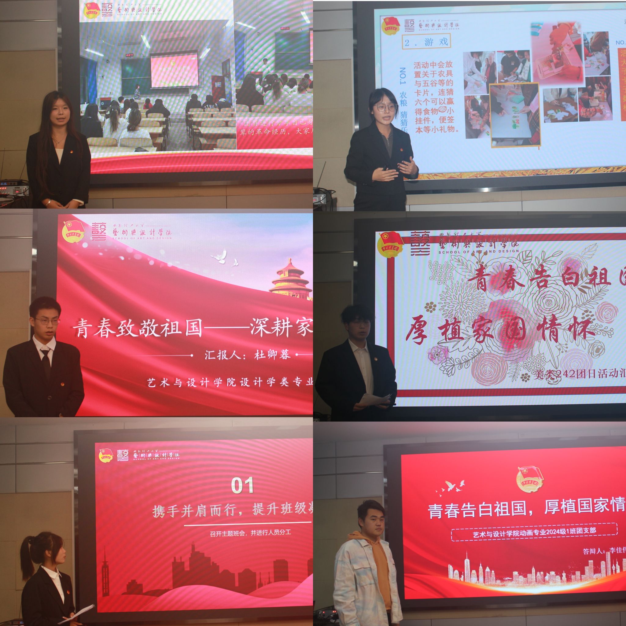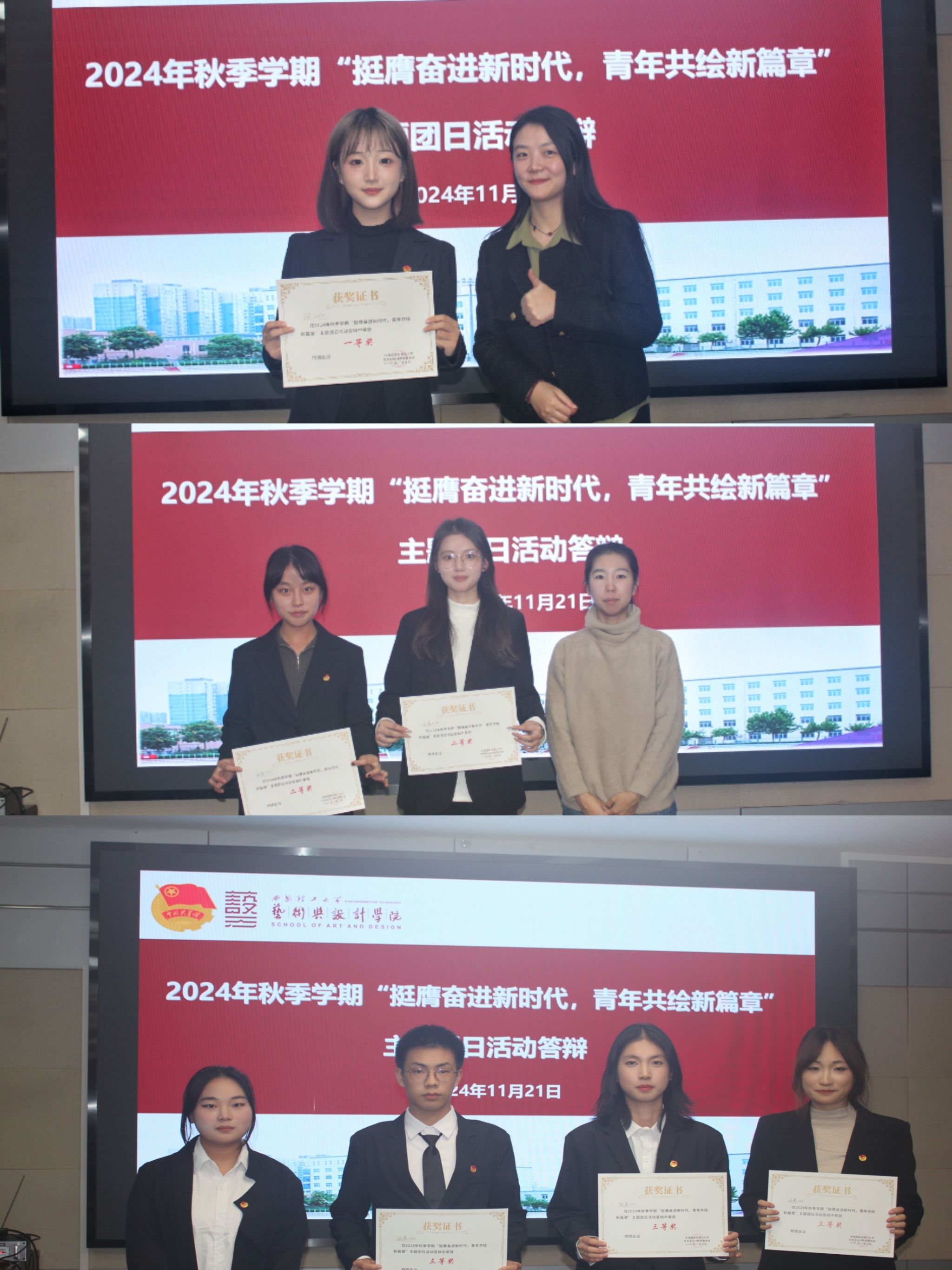 答辩会上,各团支部通过PPT展示和视频播放等多种方式,生动展现了各自支部建设成果以及丰富多彩的团日活动。他们详细汇报了在学习党的二十届三中全会精神、加强团组织建设等方面的实践情况,并结合实际,分享了围绕“青春告白祖国”“维护民族团结”“青春守护中国粮”以及“珍视生命安全”等主题所开展的一系列活动。经过评委们的认真评审,工设242团支部获院级一等奖,设类243团支部、设类244团支部获院级二等奖,设类242团支部、设类245团支部和设类246团支部获院级三等奖。赵婷、郭旭东、马依雯分别为获奖团支部颁发荣誉证书。