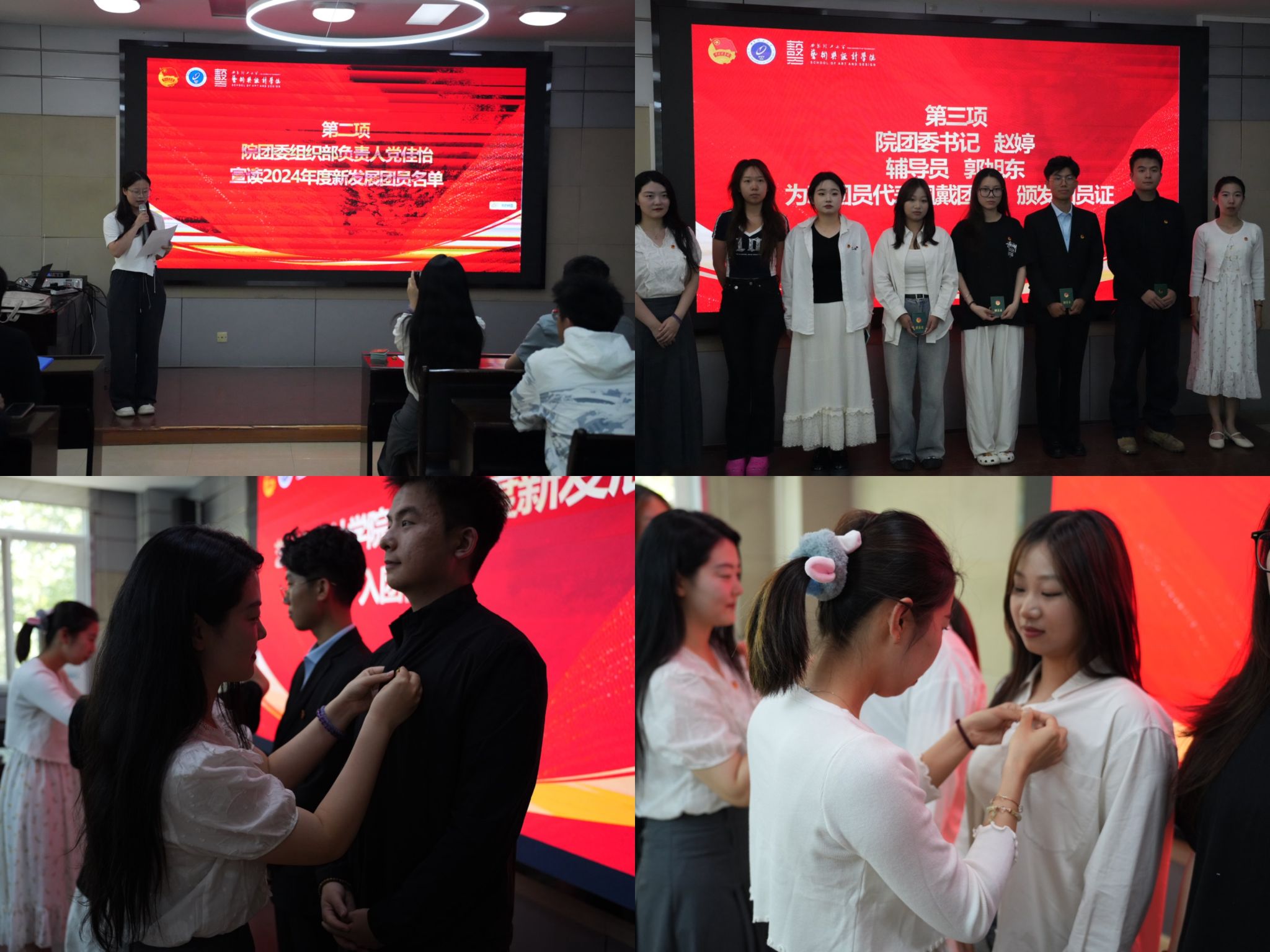 院团委组织部负责人党佳怡宣布了2024年度秋季新发展团员名单,随后,赵婷和郭旭东为新发展团员代表佩戴团徽、颁发团员证;院团委组织部负责人李彤瑶带领新发展团员进行了入团宣誓;新团员代表白宇鑫代表全体新入团的青年表态,将以入团为全新起点,把责任扛在肩头,在实践磨砺中增长才干;优秀团员代表马依雯号召新团员要将入团誓词铭刻于心,永葆赤诚初心,以实际行动践行团员责任,努力成长为堪当时代重任的新时代共青团员。