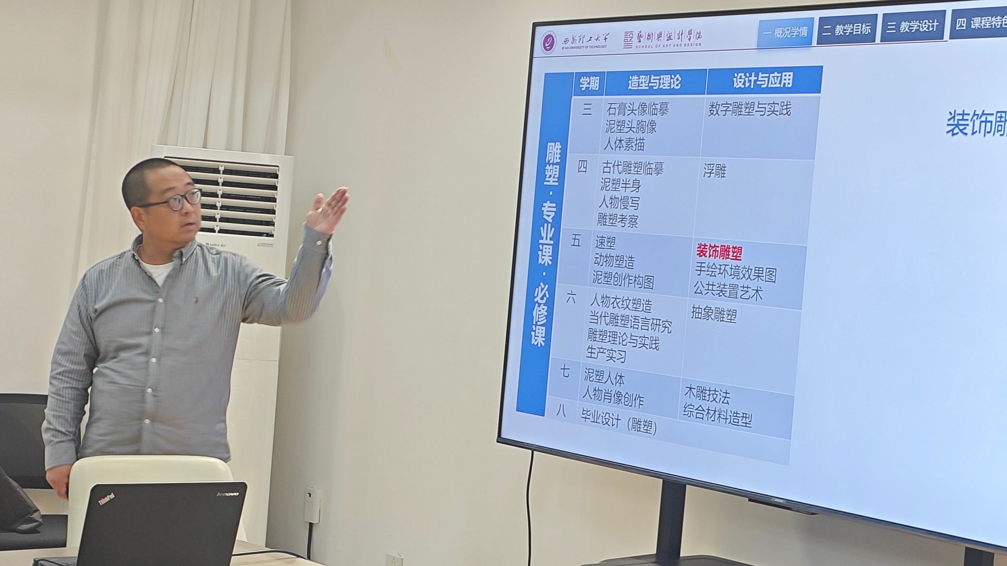 比赛中,参赛老师将国家政策、热点时事、社会主义核心价值观、精神修养等思政元素融入到课程讲解中。雕塑专业徐辉老师的《装饰雕塑》课程,以抗战主题雕塑为例,将雕塑课程与红色文化深度结合,体现出当代青年教师的家国情怀;摄影专业的张妤静老师讲的《中国美术史》、工业设计系刘洋老师的《社会与文化人类学》等课程,无不彰显出社会主义核心价值观。督导老师周世生、书记李文英就讲课内容进行质询,各专业负责人也对比赛选手给与表扬,并指出不足与他们进行了深入的互动交流。