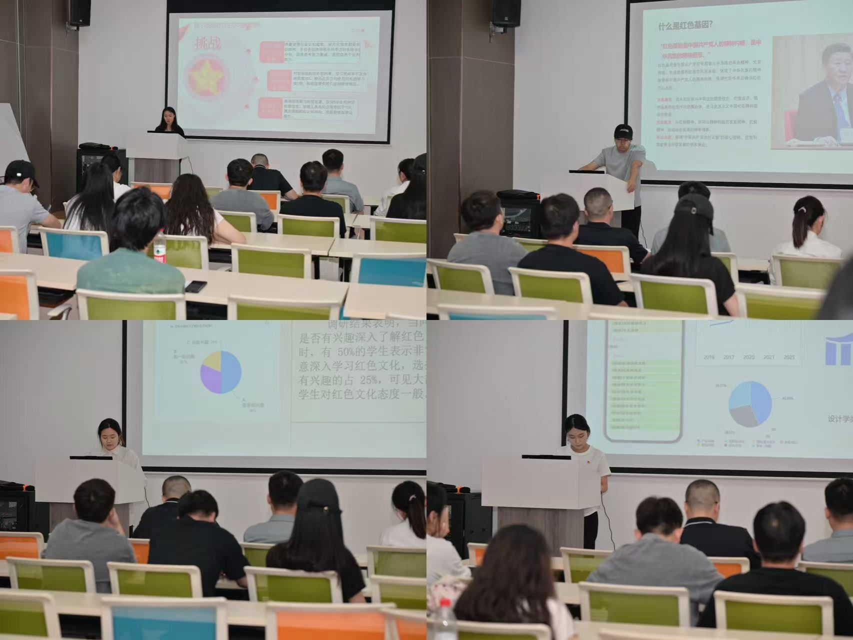 答辩分11个小组进行,每组选派1名代表做现场汇报,调研选题涵盖预备党员培训、员工就业、红色文化传承等多个方面。答辩代表分别从选题背景意义、调研方法、调研结果和意见建议等方面展开,从志愿服务过程分享到实践感悟提炼,全方位展示了实践内容,有力印证了他们在实践中的深入思考与积极探索,充分展示了调研实践成果。